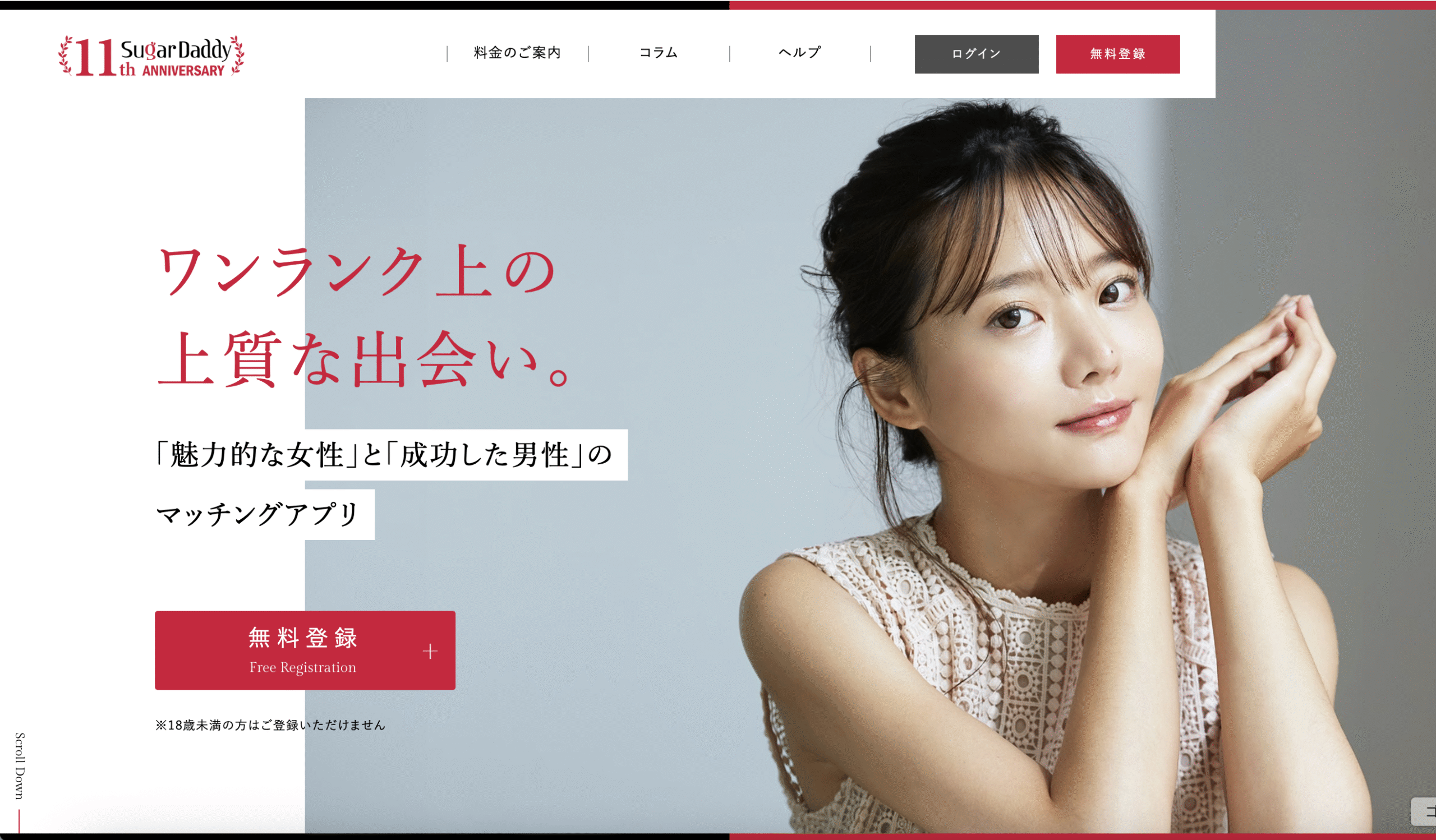 シュガーダディは、日本のパパ活アプリの先駆けのような老舗サービスである。業界随一の知名度を誇っており「パパ活女子はまずシュガダに登録する」と言われるくらい抜群の人気を誇る。